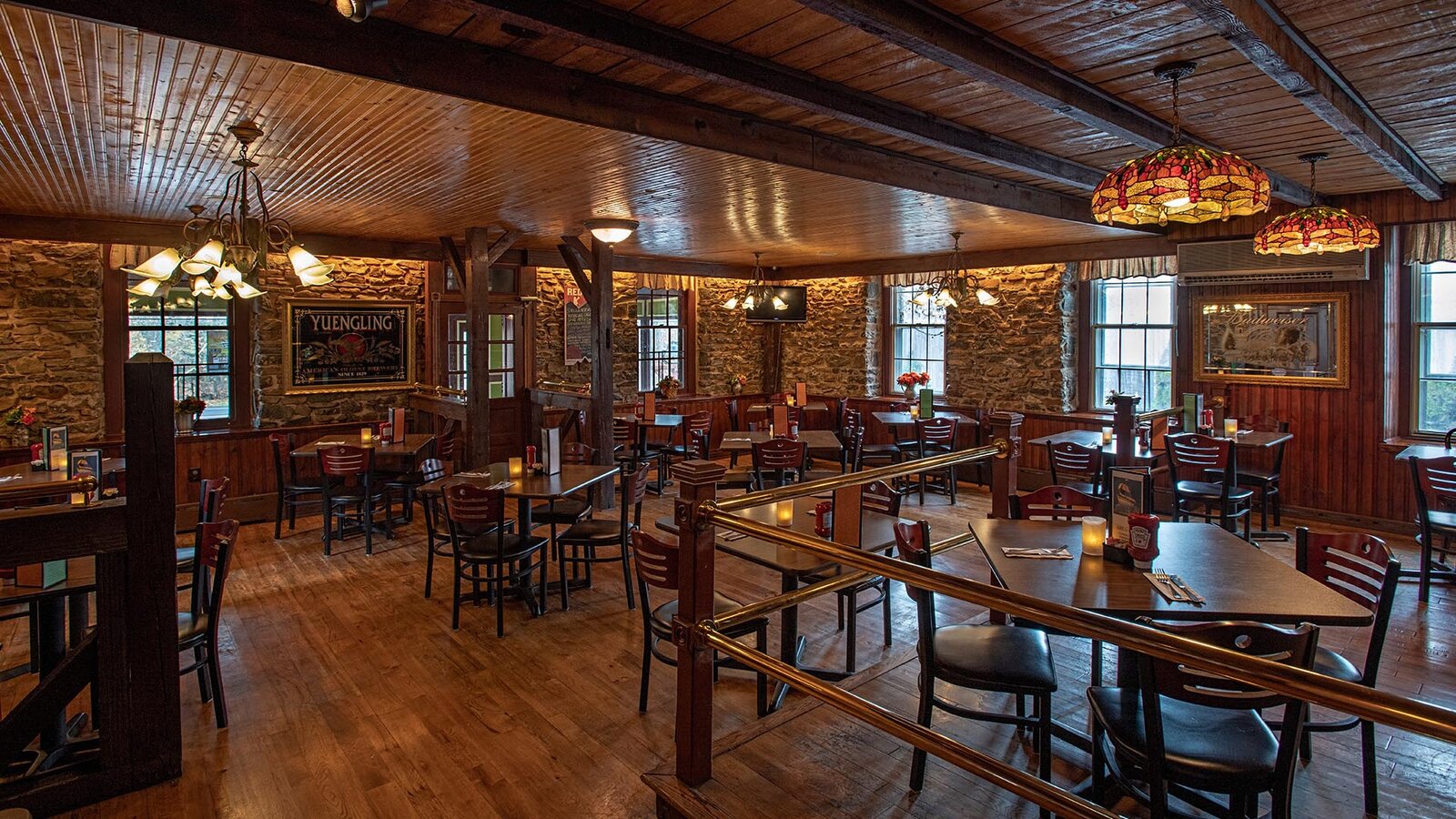 Cheeseburger topped with mushrooms and bacon with a cocktail and a pint of beer